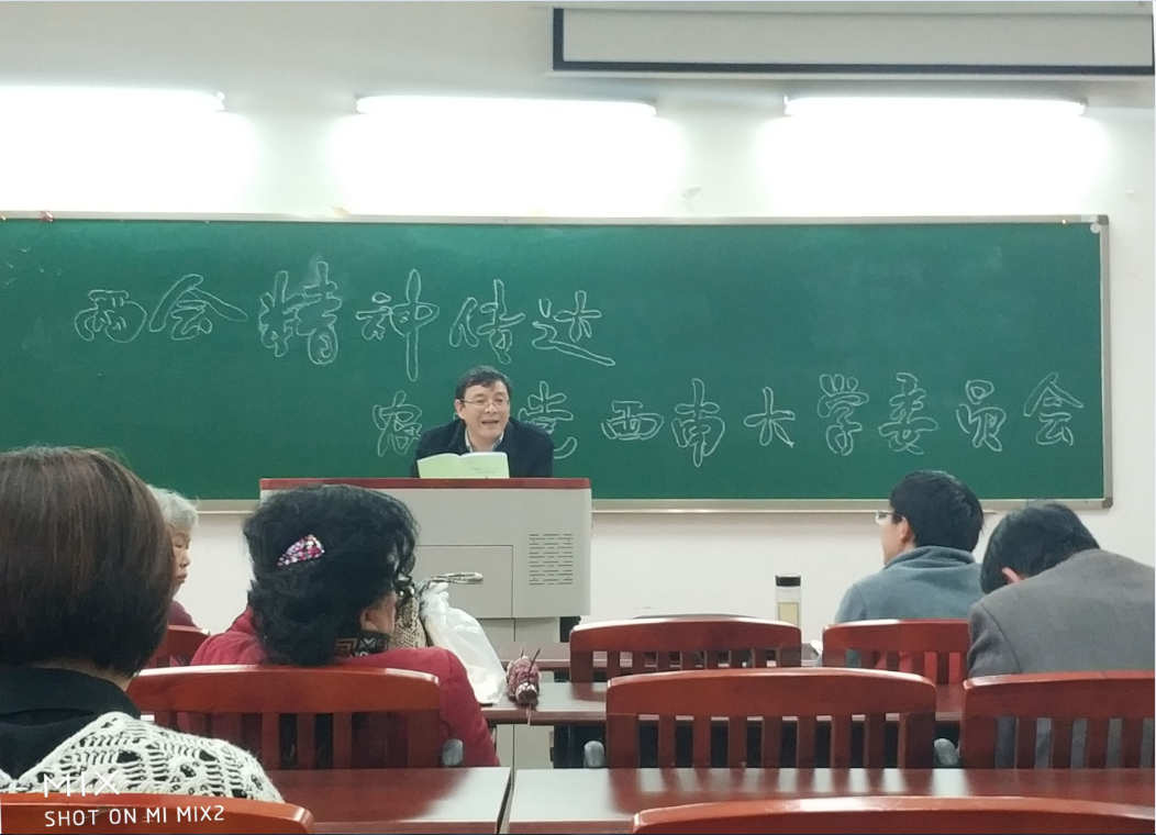 王本朝委员给全体党员讲了本次十三届政协第一次大会召开的整体情况,随后重点传达了三个方面的内容。第一是习近平总书记参加政协联组会的重要讲话精神;第二是俞正声主席做的政协工作报告的情况;第三是汪洋主席在闭幕会上的讲话。最后,王本朝委员还就自己参加这次政协大会的履职情况、参会见闻与心得等情况与党员们进行了分享。全体与会党员表示,听完“两会”精神传达,更深入地了解了本次会议的主要精神,特别是习近平总书记重要讲话精神,收获很大。(寇鹏程 供稿)