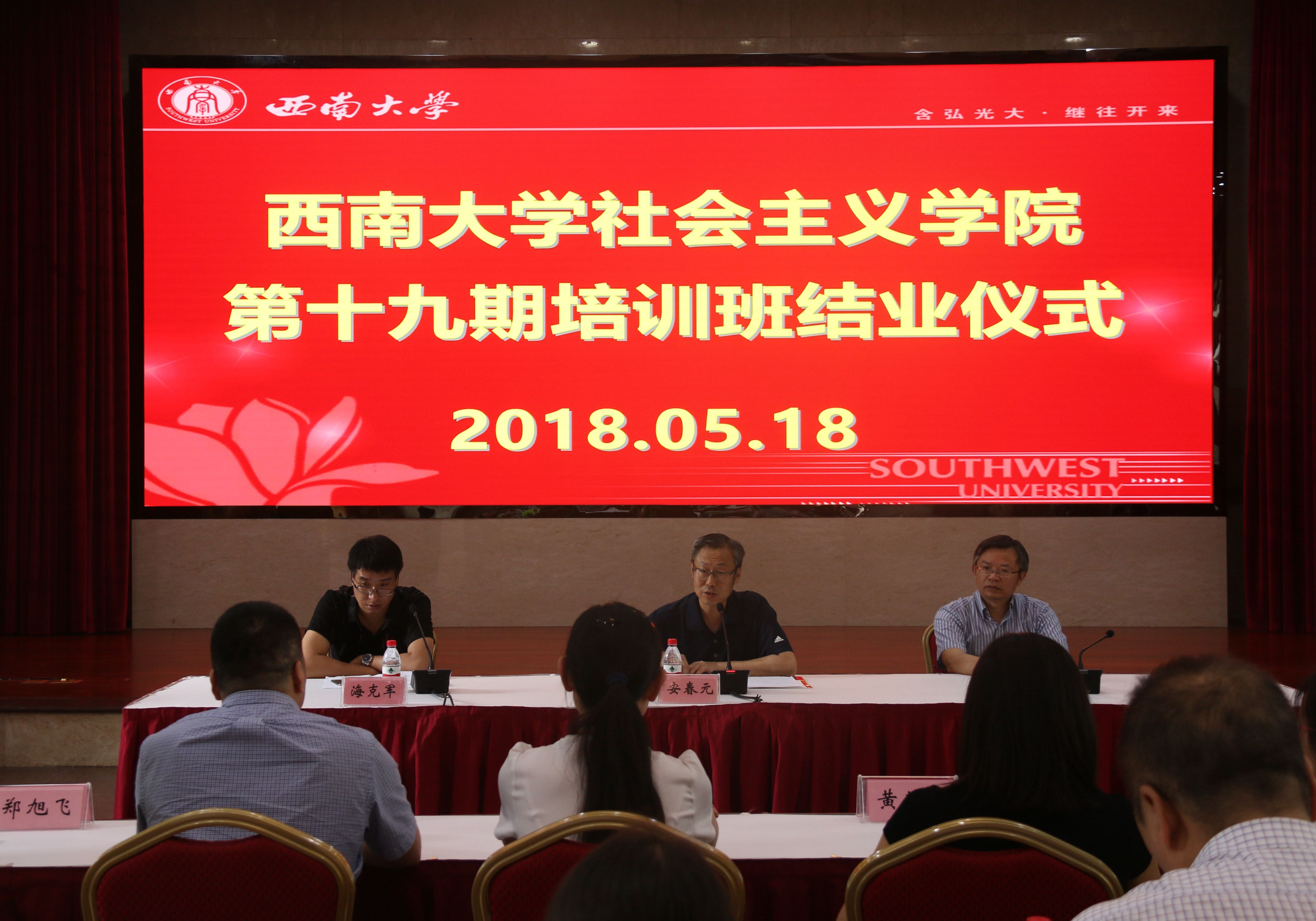 5月18日下午,学校党委举行社会主义学院第十九期培训班结业仪式。校党委副书记、社会主义学院副院长安春元,党委统战部部长、社会主义学院教务长周文全出席,党委统战部副部长、社会主义学院办公室主任海克军主持结业仪式。