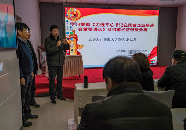 12月16日下午,应云阳县科委和民建云阳支部要求,民建Betway必威西汉姆联官方网站总支委员余世勇为Betway必威西汉姆联官方网站调研组和民建云阳支部企业会员作了“学习贯彻《习近平总书记在民营企业座谈会重要讲话》及当前经济形势分析”的报告。报告主要就中国民营经济的涵义和特征、改革开放40年中国民营经济发展回顾和成就、当前我国民营经济发展遇到的问题和机遇、促进我国民营企业发展壮大的政策等进行讲解,同时分享了北碚区发展民营经济的做法。余老师的报告深入浅出,用了许多详实的数据介绍民营经济在我国经济建设和社会发展中的贡献和作用。