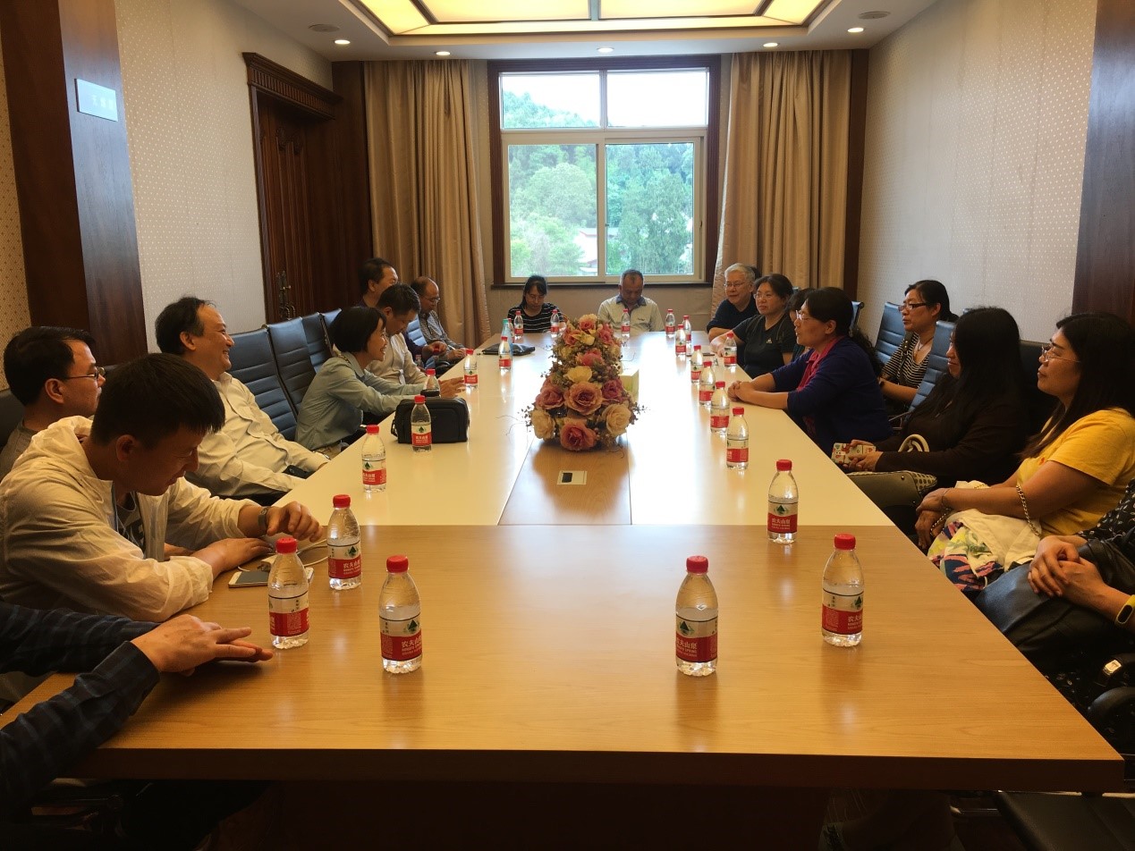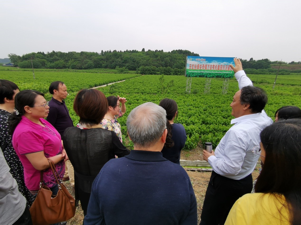 在天虹公司负责人和我校生物技术学院蚕桑丝绸专家、民进会员万永继教授的带领下,大家一起参观了天虹现代蚕业体验园、天虹关帝镇万亩有机桑园示范基地和天虹丰谷丝厂等万永继教授多年服务的蚕桑产业基地。参观结束后,天虹公司负责人和大家就经营主体模式、桑园规模、现代养蚕方式、蚕茧比较效益和利益联结机制等进行了深入探讨。天虹丝绸有限责任公司是新型民营股份制企业,公司有30000亩桑园基地,60个蚕桑重点村,联结带动近2万余户养蚕农户,蚕茧年销售产值过亿元。通过多年探索实践,天虹公司建立起了“公司+共育户+农户”的天虹模式,在蚕桑基地建设、农村土地流转、产业扶贫、技术革新、丝绸贸易、经营管理模式创新等都具有一些有价值的探索和经验,精品生丝在中国纤检局公布的抽样检验中各单项及综合指标排名名列全国前茅。来自动物科学、资源环境和化学化工等学科的会员们结合自身相关专业和经验,提出了如何结合中央和地方的有关政策优势及公司的资源特点,进一步推动蚕桑丝绸产业规模化、科学化和现代化发展的建议。