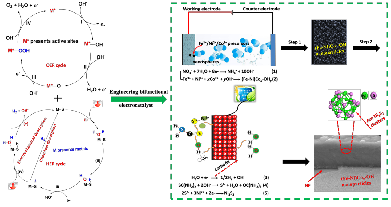析氢(HER)、析氧(OER)电极材料是构成电催化水解器的核心要素,开发低成本、高活性、高稳定性的双功能催化材料是目前世界级的挑战,基于HER和OER催化循环机理,其活性位是不相容的,单一的析氢、析氧催化剂的混合会导致活性中心的大面积相互覆盖,使得活性反而次于单一组分;因此,如何设计高活性、高稳定性的廉价材料成为棘手的关键。若能实现原子水平的混合或者纳米级裂缝的层-层组装界面策略,将最大化暴露活性位点。课题组前期为此精巧设计了基于一步电子诱导共沉积机理的原子级别(Ni-Fe)Sx/NiFe(OH)y复合催化材料,在准工业环境测试下,可以实现大电流密度超高效、稳定的水解,有望实现工业化大规模生产。为了更进一步地提升水解-氢能转换效率,降低整个水解过电位。课题组又进一步设计了非晶态(Fe-Ni)Cox-OH/Ni3S2纳米复合催化电极材料,巧妙地调控Ni3S2为非晶态,同时引入纳米裂缝和界面效应,使(Fe-Ni)Cox-OH纳米薄膜完全暴露于电解质中,该双功能材料实现了超高效的水解,可作为商业规模化运用的优选材料。进一步的DFT计算表明非晶Ni3S2活性>缺陷型>结晶型,本文工作为其他类型的复合材料设计提供了基础指南。(罗畅 供稿)