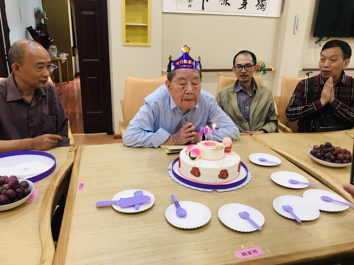 社员们的突然到来让老先生很开心,老先生精神矍铄,高兴地招呼大家围着他一起坐下。社员将鲜花献给老先生,为他点上生日蛋糕的蜡烛,戴上生日快乐的帽子,老先生双手合十许下生日愿望,吹灭生日蜡烛,社员们为他唱起生日歌。在九三学社社员们的热烈赞美声中,老先生切开了生日蛋糕……