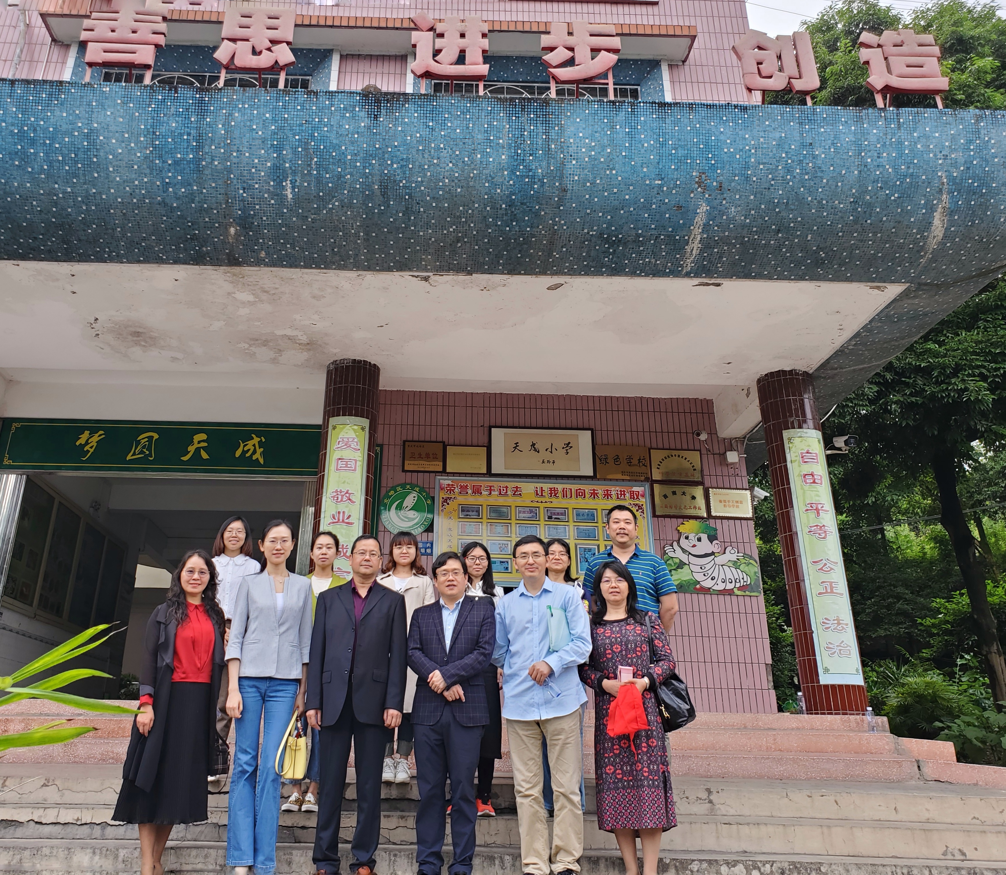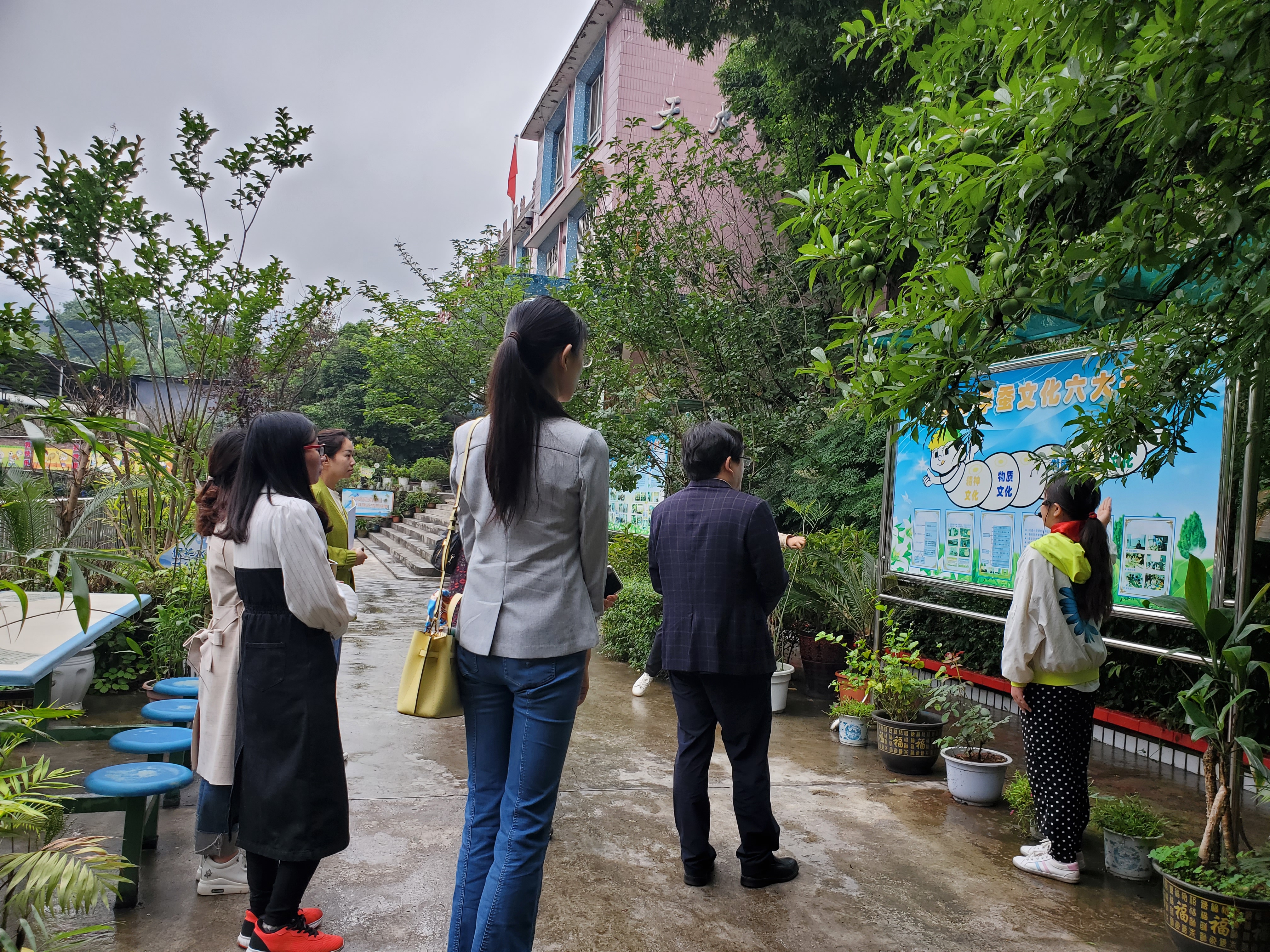 5月24日清晨,民盟Betway必威西汉姆联官方网站二支部全体委员前往北碚区童家溪镇建设村天成小学调研。民盟二支部艾兴、许文菊、刘仕平、刘永红、郭好与天成小学校领导及“乡村教育蚕文化特色岗位工作室”学员参加了本次活动。在听取了胡长全校长关于学校整体办学情况介绍之后,大家参观了学校蚕桑养殖园以及小学生们以“蚕”为主题制作的作品,并与天成小学老师从特色文化建设和教育、教学两个方面,探讨了乡村振兴背景下适应北碚区乡村小学的发展路径。