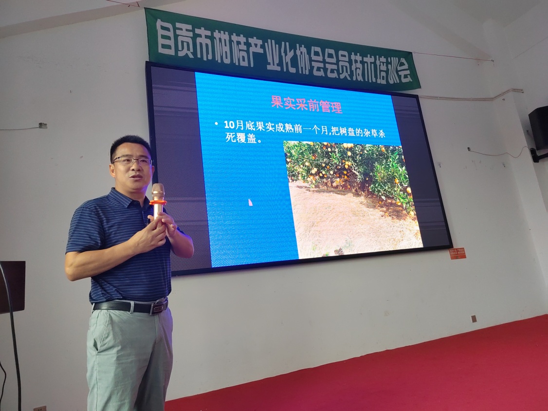 27日专家组在自贡丰收农业有限责任公司(以下简称丰收公司)李恒恒总经理带领下,先后到富顺骑龙镇、板桥镇、沿滩区九洪乡、沿滩镇等4个柑橘基地,向“丰收公司”的技术骨干现场指导果园生产中存在的肥水管理、病虫害防治和枝梢管理等问题,并指出了当前的工作重点。28日上午,在“丰收公司”会议室,淳长品副研究员和贺明阳博士分别对来自自贡市各区县经作站和自贡市柑桔产业协会会员进行了“柑橘秋冬季管理”“柑橘裂果防治技术”和“柑橘采收及商品化处理”等专题讲座。下午,与会人员到自流井何市镇明日见基地参观了由“丰收公司”自主安装的水肥一体化系统,由淳长品副研究员讲解了柑橘园微灌系统的使用方法和节水节肥省人工的优点。