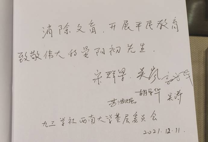 随后,宋群梁一行来到位于柑桔研究所内的晏阳初纪念馆参观。晏阳初是国内外享有盛誉的乡村建设理论和实践家,他毕生从事平民教育事业,参与并指导了中国和广大发展中国家的乡村改造活动,取得了巨大成就。纪念馆以晏阳初生平为线索,按时间顺序分为7个单元,通过图片、文字、实物和影像资料,着重讲诉了晏阳初于1940年在北碚创办乡村建设学院的历程,这是中国首次有了专门为农村培养从事实际建设人才的高等学府,开创了中国乡村建设教育事业的新纪元。参观完后,宋群梁表示,学习并借鉴晏阳初先生平民教育思想对当前我国开展的乡村振兴建设具有重要的现实意义,应邀在留言簿上写下“消除文盲,开展平民教育,致敬伟大的晏阳初先生”。
