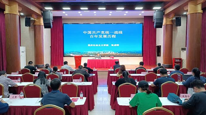 开班仪式结束后,重庆社会主义学院张成明副教授为学员们作了“中国共产党统一战线百年发展历程”专题教学。