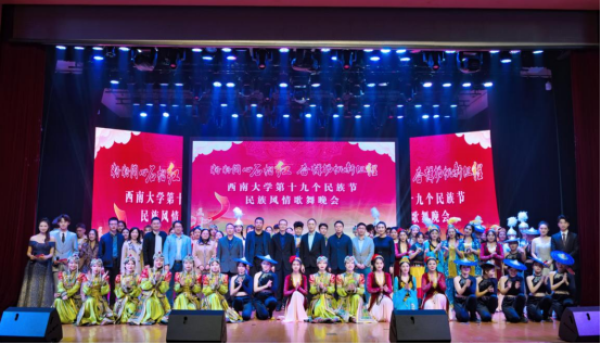当晚,民族风情歌舞晚会在光大礼堂举行。黄杰副书记,党委统战部、党委组织部、党委宣传部、党委学工部、校团委、历史文化学院 民族学院等单位负责人全程观看晚会。晚会分为“文化传承同心圆”“青春奋进竞璀璨”和“美美与共梦相连”三个篇章。各族儿女载歌载舞,端庄华贵的舞动、轻快优美的姿态、高亢的民歌、精彩绝伦的合奏以及红色故事朗诵展现了中华文明的兼收并蓄、中华民族的多元一体、各族人民团结奋进的盛世风貌,现场气氛热烈,座无虚席。