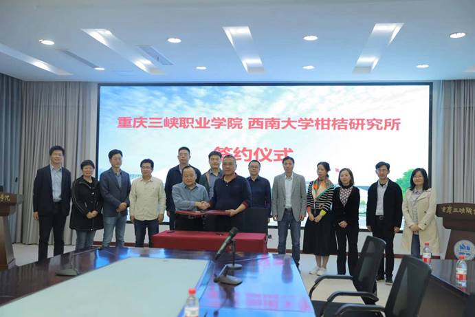 重庆三峡职业学院将面向柑桔产业打造专业群,就柑桔科研、教学、培训等内容与柑桔研究所签订了战略合作协议。在太龙镇古红桔生态示范园,胡军华针对果园主要的病虫害问题,强调了全年柑桔病虫害控制要点及相关药剂,提议产区需要增强杀菌剂使用次数及栽培管理。淳长品强调了秋冬季节柑桔肥水管理,促进花芽分化,提高明年开花和结果数量,进而提高产量的技术措施。在随后植保站和果树站组织的“三峡柑桔技术研究中心重大疫病防控技术研讨会”上,胡军华、淳长品和陈善春就万州地区柑桔溃疡病的综合防控技术方案进行了分享和讨论。大家通过座谈达成共识,溃疡病的防控是一个长期过程,是柑桔田间生产管理的内容之一,需要一套完善有效的防控方案,需要从抗病品种选育推广、严格检疫措施、规范农事操作、减少病害传播、分策略管理发病果园、药剂筛选和关键时期防控、加强对防控技术的宣传和培训等方面开展工作,建议建立专项资金进行溃疡病抗病性研究及防控技术示范及推广工作。希望通过合作,为重庆万州区的柑桔产业发展保驾护航。