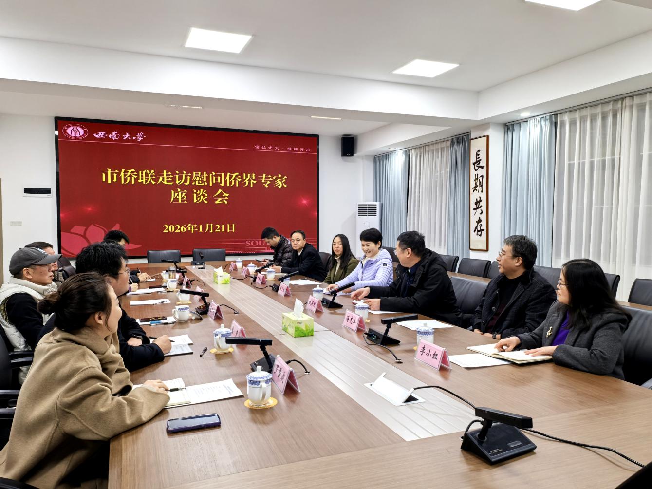 1月21日,重庆市侨联党组书记、主席,市委统战部副部长孟卫红一行来校慰问侨界专家,学校党委副书记武好明陪同慰问。活动在学校党外人士之家“同心楼”举行。