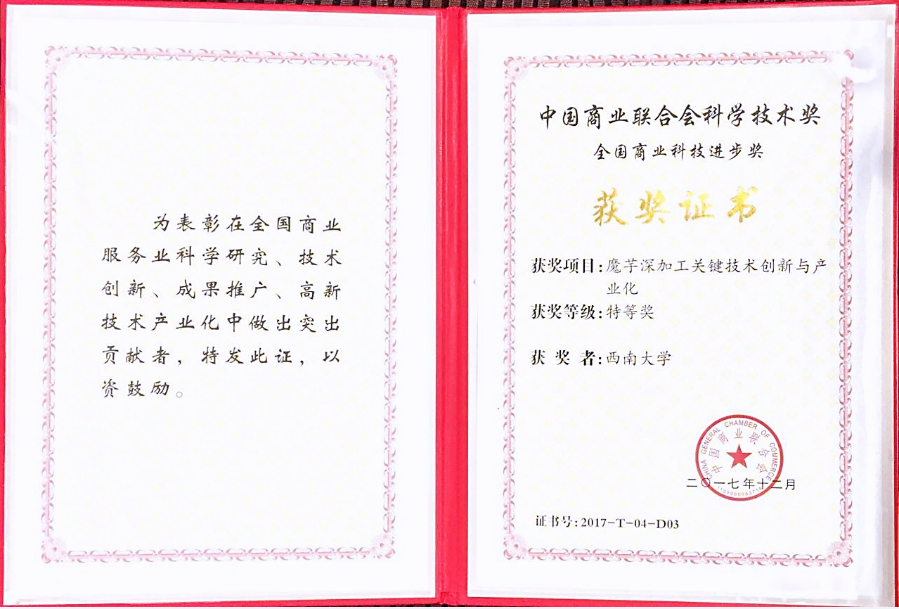 据悉,中国商业联合会是国家科技进步奖的推荐单位。2017年中国商业联合会科学技术奖获奖项目共有318项,其中特等奖项目共有8项。学校魔芋团队将在产学研深度融合的技术创新体系之下,持续推动产业科技创新,加快科技成果转化,为我国魔芋产业持续健康稳定发展做出新的贡献。