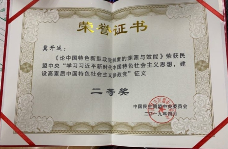 为深入学习、贯彻习近平新时代中国特色社会主义思想,民盟中央于2018年开展了“学习习近平新时代中国特色社会主义思想,建设高素质中国特色社会主义参政党”征文活动,冀开运教授的论文《论中国特色新型政党制度的渊源与效能》获得二等奖。