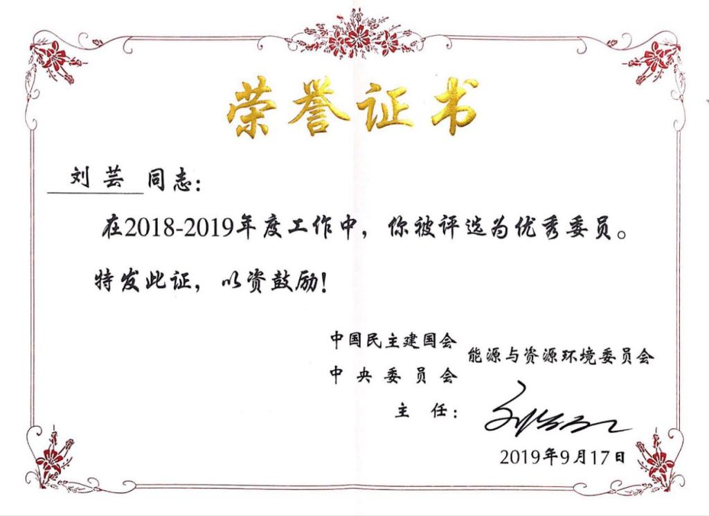 民建刘芸教授被评为民建中央能源与资源环境委员会优秀委员