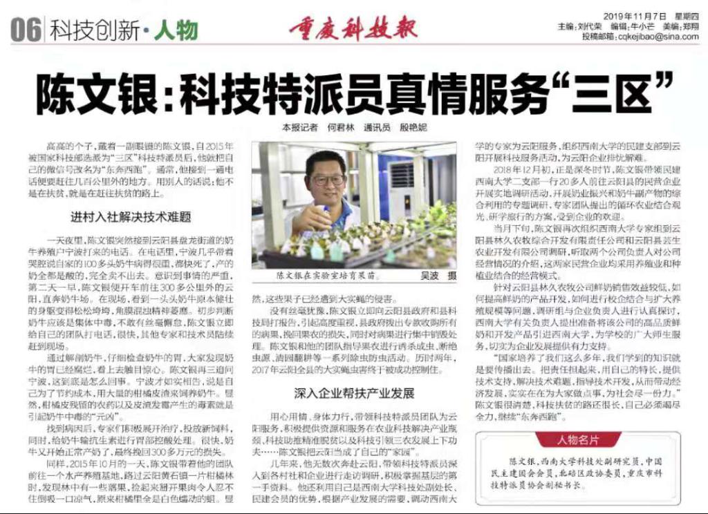 11月1日至11月7日,《人民政协报》、《重庆政协报》、《重庆科技报》等多家国家和地方新闻媒体分别在显著位置对北碚区政协委员、国家“三区”科技人才、重庆市科技特派员云阳团副团长陈文银副研究员带领科技特派员团队开展科技服务活动的先进事迹进行了连续报道。