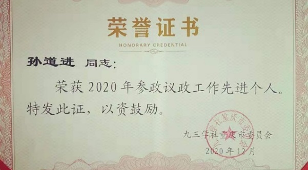 孙道进是九三学社社情民意和参政议政工作的典型代表之一,他充分利用自身优势,积极关注民生,努力建言献策,开展多形式、多层次、多领域参政议政和民主监督工作,充分体现了民主党派成员的担当精神。