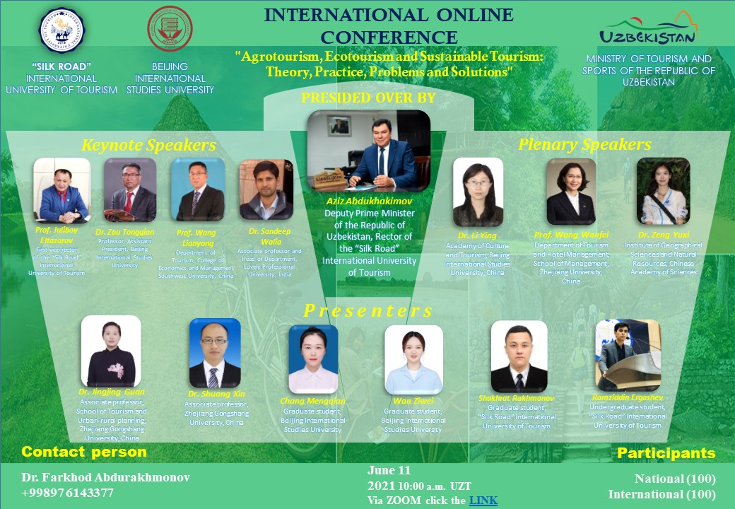 6月11日,乌兹别克斯坦丝绸之路国际旅游大学和中国北京第二外国语学院联合发起“农业旅游、生态旅游和可持续旅游——理论、实践、问题与解决方案”国际学术论坛。乌兹别克斯坦共和国副总理Aziz Abdukhakimovz致开幕词。乌方的丝绸之路国际旅游大学校长Juliboy Eltazarov教授、中方的北京第二外国语学院旅游学院院长邹统钎教授、Betway必威西汉姆联官方网站经济管理学院王连勇教授做主旨演讲。