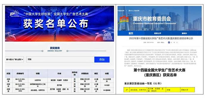 近日,学校农工党党员、文学院教师田骏带领学生在“中国大学生好创意”第14届全国大学生广告艺术大赛中斩获佳绩,《光阴列车》《钟阿姨和她的风火三轮车》《成长底色,非常可乐》三部作品荣获优秀奖,其中,《成长底色,非常可乐》获得重庆赛区一等奖。