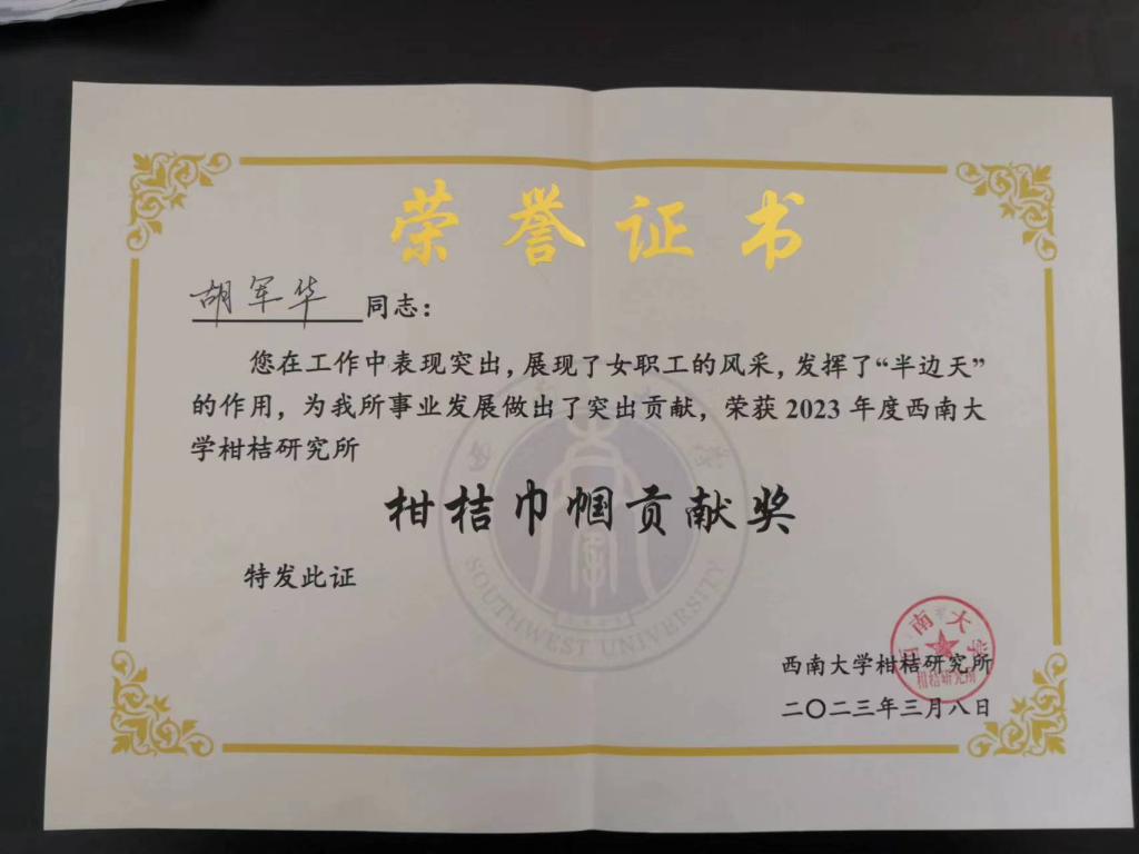 阳春三月,春暖花开。在第113个“三八”国际妇女节之际,九三学社Betway必威西汉姆联官方网站四支社主委、植保专家胡军华在Betway必威西汉姆联官方网站柑桔研究所召开的2023年“柑桔巾帼贡献奖”表彰大会上获奖并作为获奖代表发言。