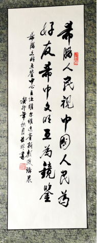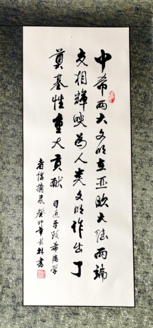 装裱的书法更加鲜明体现汉字之美,王勇秘书长将这些作品赠送给了参与活动的希腊朋友。得到赠品的希腊朋友无不欣喜异常,他们表示这些书法作品是传递中国文化的形象符号,有如绘画一样的美感,让他们真实的感受到了悠久中国文化的魅力。在得知这些作品是一位年满80周岁的老人书写时,希腊朋友称赞有加,并请王勇秘书长回国后代他们向书法的作者致意。
