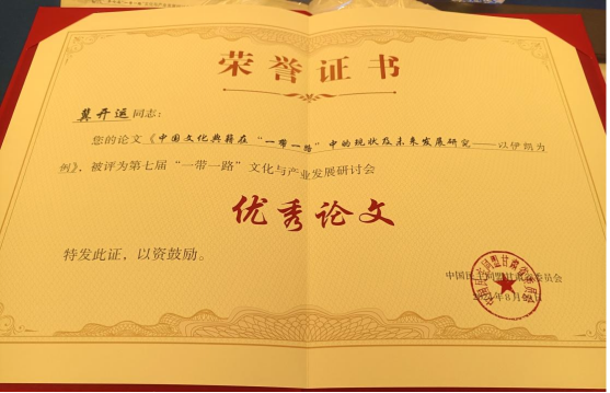 民盟盟员冀开运文章被评为“一带一路”文化与产业发展研讨会“优秀论文”