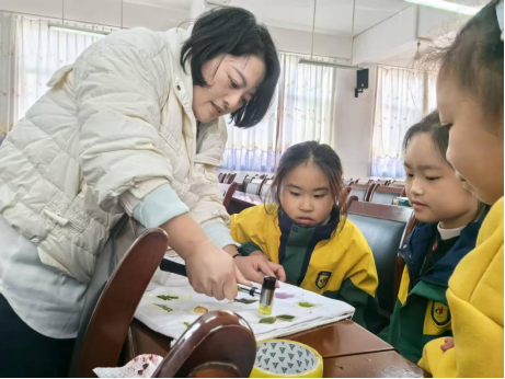 活动伊始,刘亚敏副教授作了科普专题讲座,激发了同学们对科学探究的兴趣。随后,学生分组开展探索实践:第一组在刘亚敏老师指导下学习“植物拓染”,感悟自然美学;第二组跟随吕瑜良老师进行“校园植物探秘”,实地识别草木、记录特征。最后,两组学生汇合协作,共同制作“树叶魔法帽”,利用自然材料开展创意手工制作。