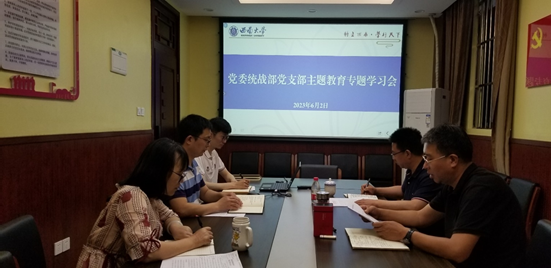 会上,郭从蓉同志原文领学《习近平著作选读》(第一卷)篇目《深刻认识做好新形势下统战工作的重大意义》。集中学习原文后,与会党员交流了学习心得。海克军在发言中表示,习近平总书记的这篇重要讲话是习近平新时代中国特色社会主义思想蕴含的世界观和方法论在统战工作方面的体现,对高校统战工作具有非常重要的指导意义。高校是统战工作的重要阵地,我们要从政治高度看待高校统战工作,从实践和方法论角度思考高校统战工作如何去做。要以主题教育为契机,抓好党外优秀年轻干部队伍建设等统战工作调研,着力解决工作中存在的突出问题,推动学校统战工作高质量新发展。金更兴结合自身工作经历,认为习近平总书记的重要讲话为统战工作提供了重要的方法论指导,作为统战干部,要从把握政策、熟悉情况、遵循规律、积累经验、掌握方法等方面入手做好统战工作。黄启庭认为习近平总书记在讲话中强调了统一战线和统战工作的重要地位和作用,我们要加强业务学习,学《条例》,学统战理论政策,掌握好统战工作的方式方法。