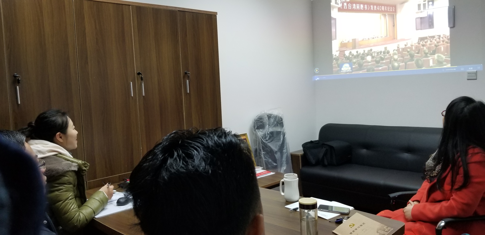 全体党员集体收看了习近平总书记在《告台湾同胞书》发布40周年纪念会上的重要讲话视频,观看了《我们一起走过——致敬改革开放40周年》专题片。观看结束,党员同志们心潮澎湃,大家一致认为,习近平总书记的重要讲话全面总结了70年对台工作的不平凡历程,鲜明昭示了祖国必然统一的历史大势,深刻阐述了立足新时代、在中华民族复兴伟大征程中推进祖国和平统一的重大政策主张,是指导我们新时代对台工作的纲领性文献。周文全书记要求,党委统战部要把学习贯彻习近平总书记重要讲话精神作为统一战线的重要任务,要组织学校的台胞台属深入学习领会讲话精神,最广泛地团结海内外中华儿女,最大限度地争取台湾民心,为推进祖国和平统一、实现中华民族伟大复兴的中国梦贡献力量。