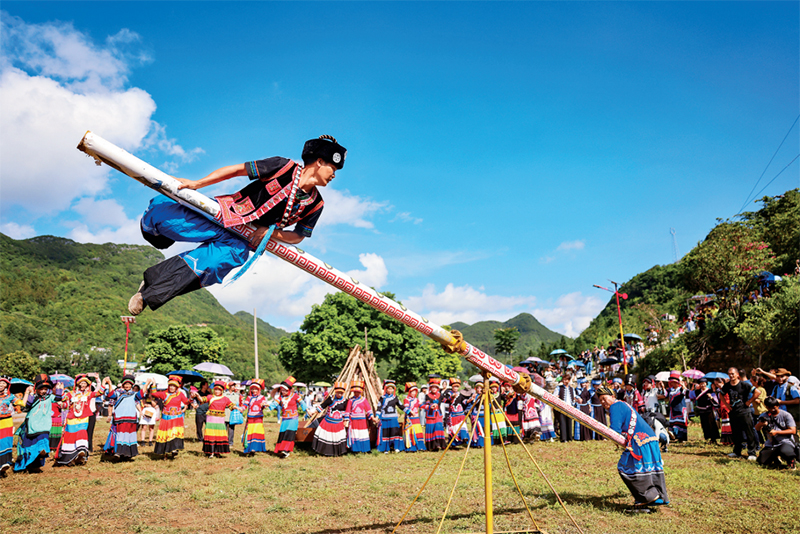 2023年8月10日是彝族传统节日火把节,广西百色市隆林各族自治县德峨镇阿搞屯的村民在取火祭火、祭送布谷鸟、打磨秋、抹黑脸、篝火晚会等民族特色活动中欢庆节日、传递祝福。图为村民展示彝族传统习俗——打磨秋。