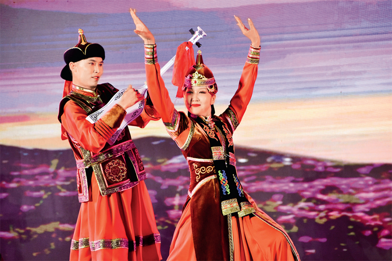 《玛纳斯》、《格萨尔》、《江格尔》三大民族英雄史诗是被纳入我国第一批国家级非物质文化遗产名录的文化瑰宝。2023年7月13日晚,在新疆克孜勒苏柯尔克孜自治州举行的第九届玛纳斯国际文化旅游节上,三大史诗同台会演,吸引众多观众前来观看。图为新疆博尔塔拉蒙古自治州歌舞团演员在表演《江格尔》。
