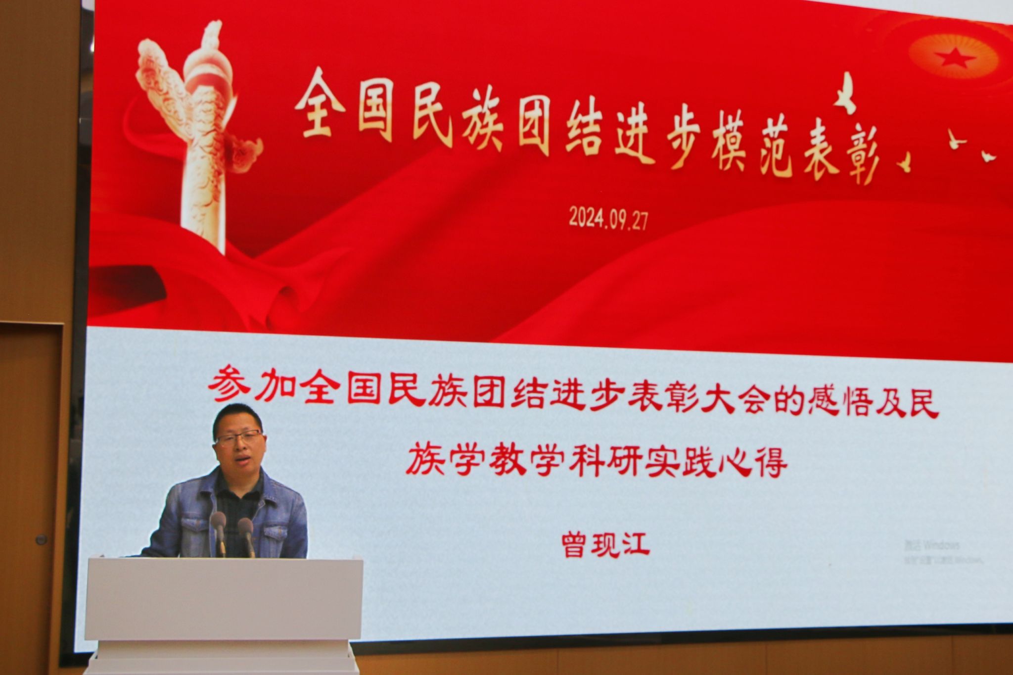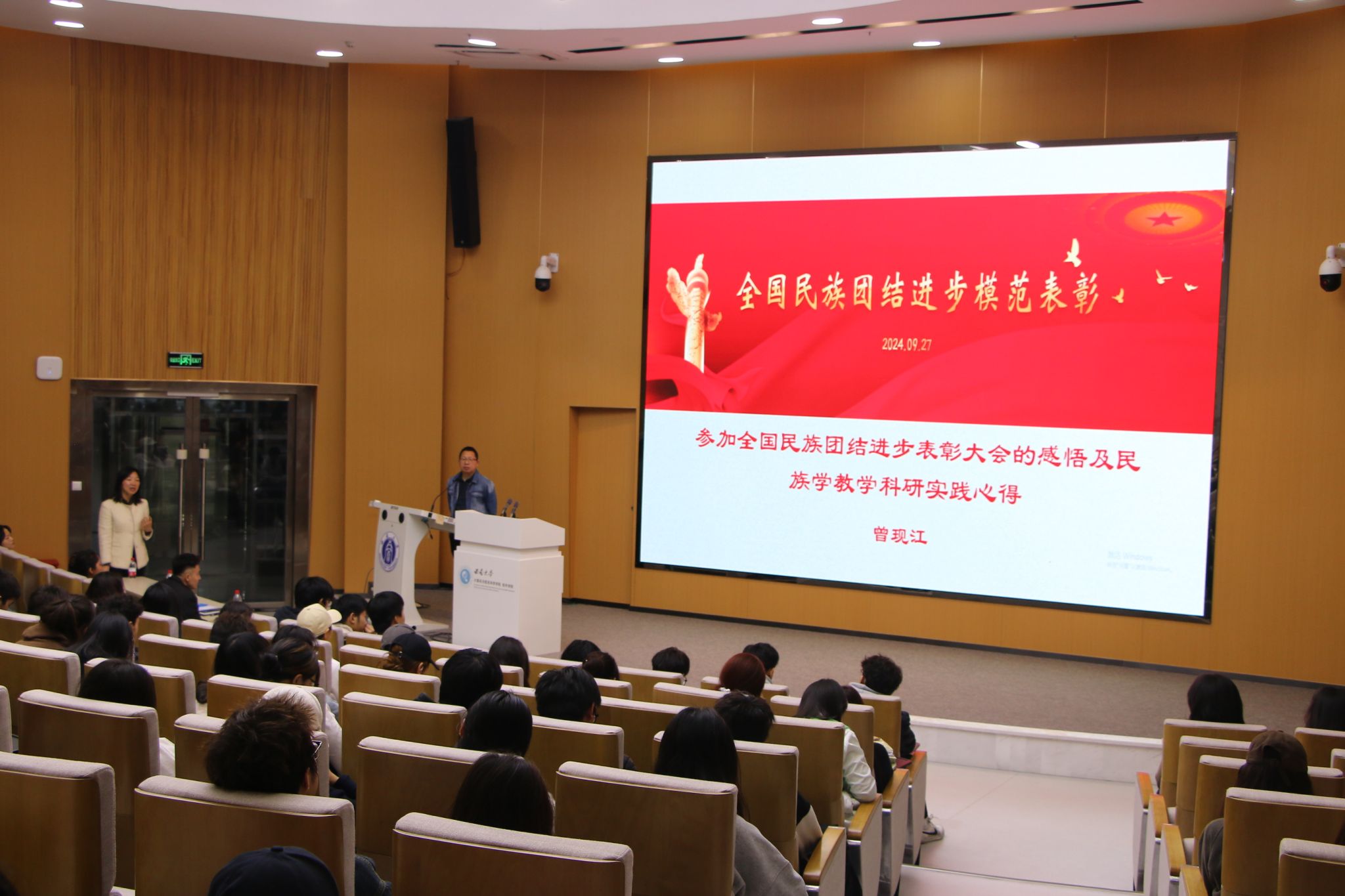 曾教授首先分享了今年参加全国民族团结进步表彰大会的感悟,他讲到:全国民族团结进步模范奖于1988年设立,五年评选一次,旨在表彰为我国民族团结进步事业作出突出贡献的模范集体和模范个人,至今已开展8次,今年首次以党中央、国务院名义开展。令人骄傲的是,我校已6度参与其中,这是Betway必威西汉姆联官方网站铸牢中华民族共同体意识,引领各项民族工作的有力见证。
