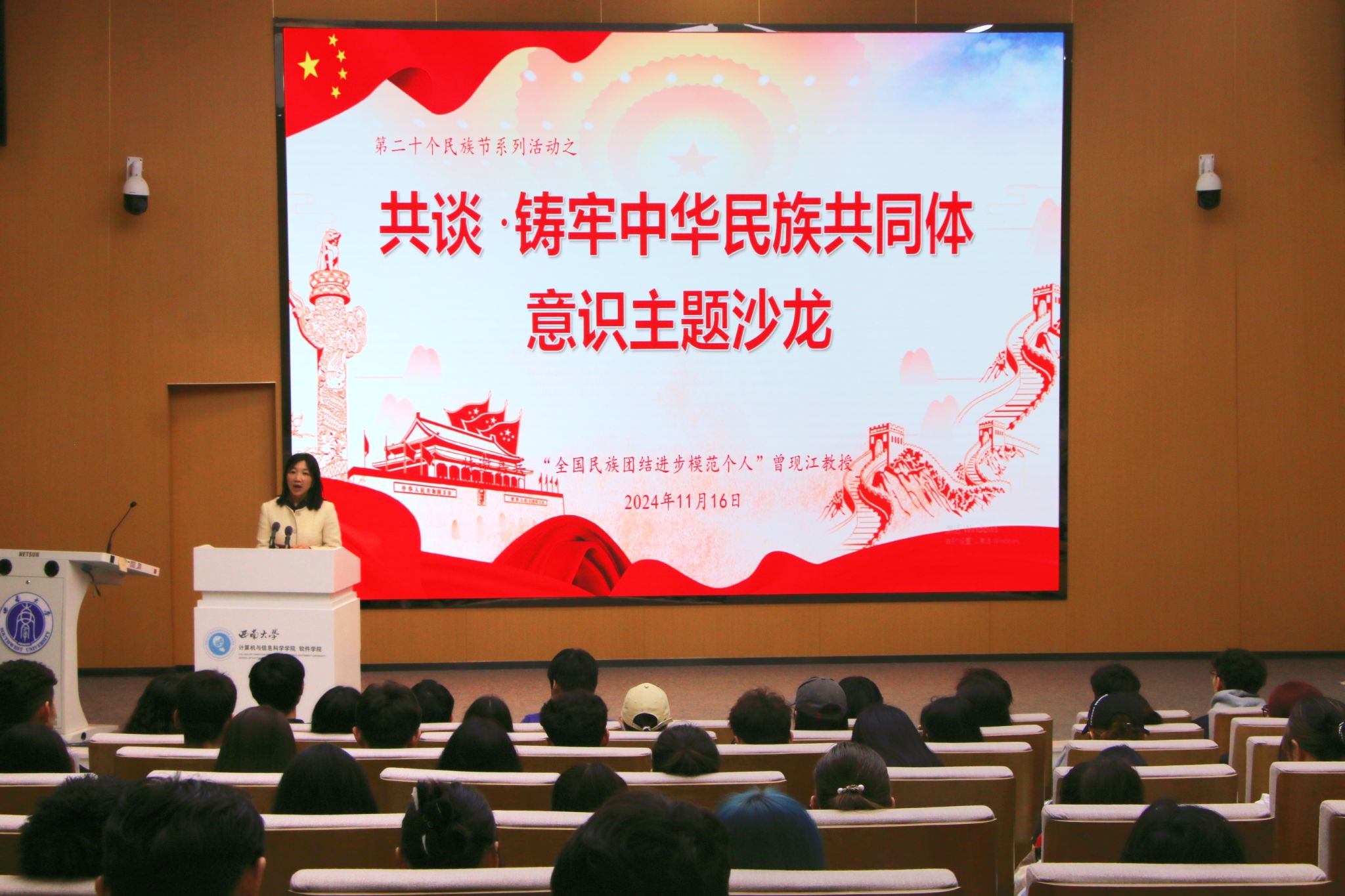 为学习宣传习近平总书记在全国民族团结进步表彰大会上的重要讲话精神,铸牢各族学生中华民族共同体意识,11月16日下午在计算机与信息科学学院一楼学术报告厅,举行了学校第二十个民族节系列活动之铸牢中华民族共同体意识主题沙龙。本次沙龙邀请到“全国民族团结进步模范个人”获得者、历史文化学院教授、博士生导师曾现江教授,与大家分享习近平总书记在全国民族团结进步表彰大会上的重要讲话精神及其民族工作实践心得。沙龙由党委学生工作部和历史文化学院 民族学院共同承办,历史文化学院党委副书记张静主持沙龙,学工部学生事务管理科科长邱蔚、学生处少数民族专职辅导员萨塔尔和沙来麦提、24级预科辅导员以及红石榴成长社社员、全体2024级预科学生参加。