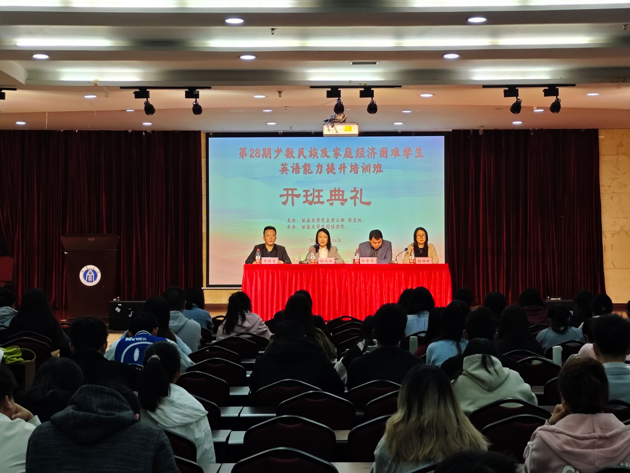 开班仪式上,外国语学院党委书记徐天虹老师致欢迎辞,强调学校对少数民族及家庭经济困难学生的关怀与支持,并鼓励同学们珍惜学习机会。外国语学院社会服务中心主任余晓光老师随后介绍了培训课程安排及要求,强调培训的针对性和纪律性。学生代表发言表达了对学校和老师的感谢,并承诺将珍惜机会、努力学习。最后,助学中心孙金春主任总结讲话,再次强调学校对学生的支持,并鼓励同学们通过培训提升自我。